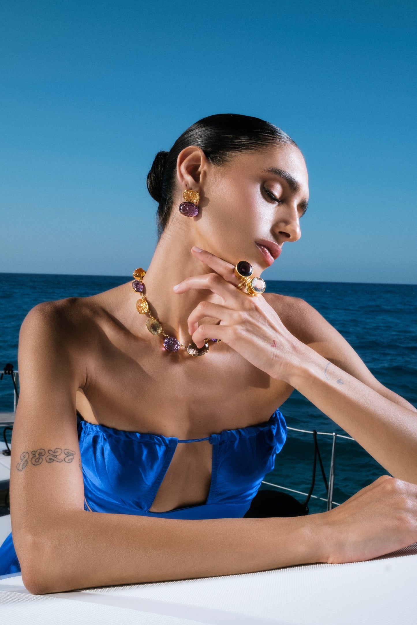 From abstract shapes to delicate forms, this collection revolves around the luminous beauty of stones. Precious and semi-precious stones are set in 21kt gold to create pieces that capture the light and dazzle. The use of the vibrant citrine, the deep blue of sapphire, the fiery rubies, and the radiant greens of emeralds adds bursts of color and unique character to every design, making them truly distinctive and eye-catching, becoming the perfect colorful statement.